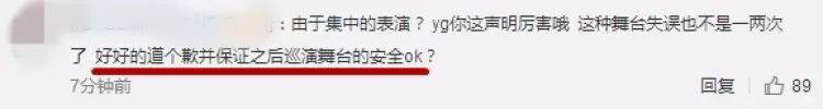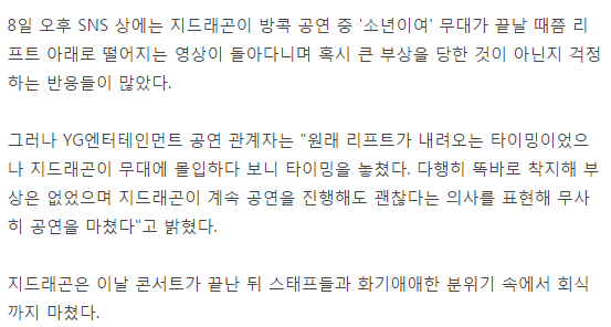 声明中YG的负责人表示:原本为升降机降下的时机,但GD因过于投入错过时机,庆幸的是医生表明因为是笔直落地没有受伤,所以不会影响公演。