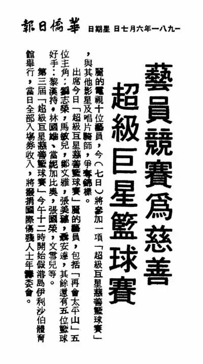 16. 1981年6月7日,参加第三届“超级巨星慈善篮球赛”,当日全部入场券收入将捐予国际伤残人士年筹委会。
