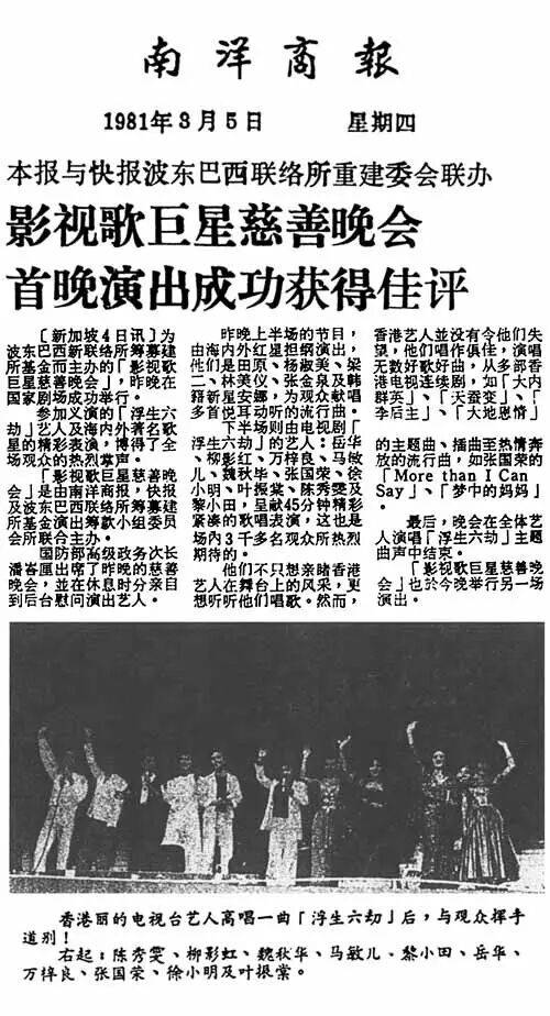 15. 1981年3月3-4日,参加新加坡为波东巴西新联络所筹募建所筹募所基金而举办的“影视歌巨星慈善晚会”。演唱《More thani can say》《梦中的妈妈》《相识也是缘分》等歌曲。