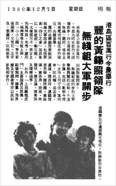 13. 1980年12月7日,“香港公益金”慈善机构举行的“港岛区百万行”步行筹款活动在政府大球场起步,香港四大传播机构均组成步行队伍共襄善举,张国荣以丽的电视台《小小心愿》演员身份参加。