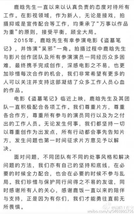 其经纪人表示,鹿晗方忽然之间提出了很多违反我方合约的不合理要求,否则不配合电影宣传,为了片方,我方作了妥协。但对于鹿晗那边临时提出,“所有单人海报加入每个演员的番位”一事,我方绝不同意。“(片方)一再承诺这不是粉丝电影,是个大格局电影,现在是闹什么?现在请告知我要退让的底线?”