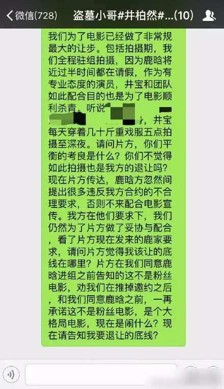 1月14日下午,井柏然经纪人张阿信发布微博称“岂曰无衣?与子同袍。关于盗墓,我们让,不撕。”其微博中提到井柏然方为了这部戏已经作了很大的让步,最初在角色选择上,因为片方要用新的演员组合,井柏然已经从吴邪让步到张起灵。而在拍摄时,鹿晗将近过半的时间都在请假,但井柏然作为有专业态度的演员,全程驻组,每天穿着几十斤重的戏服从5点拍摄至深夜。