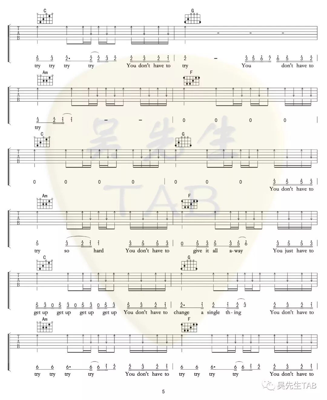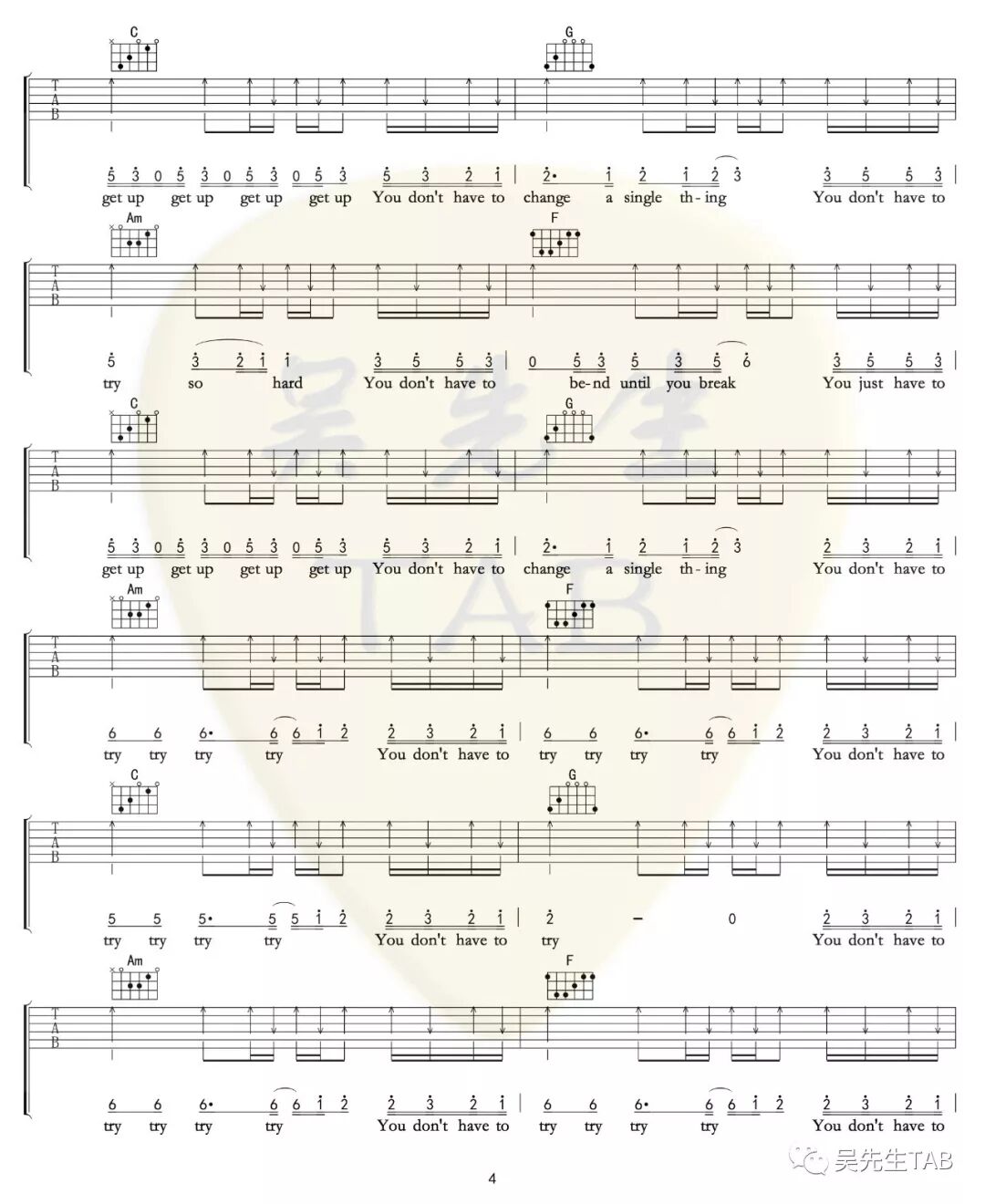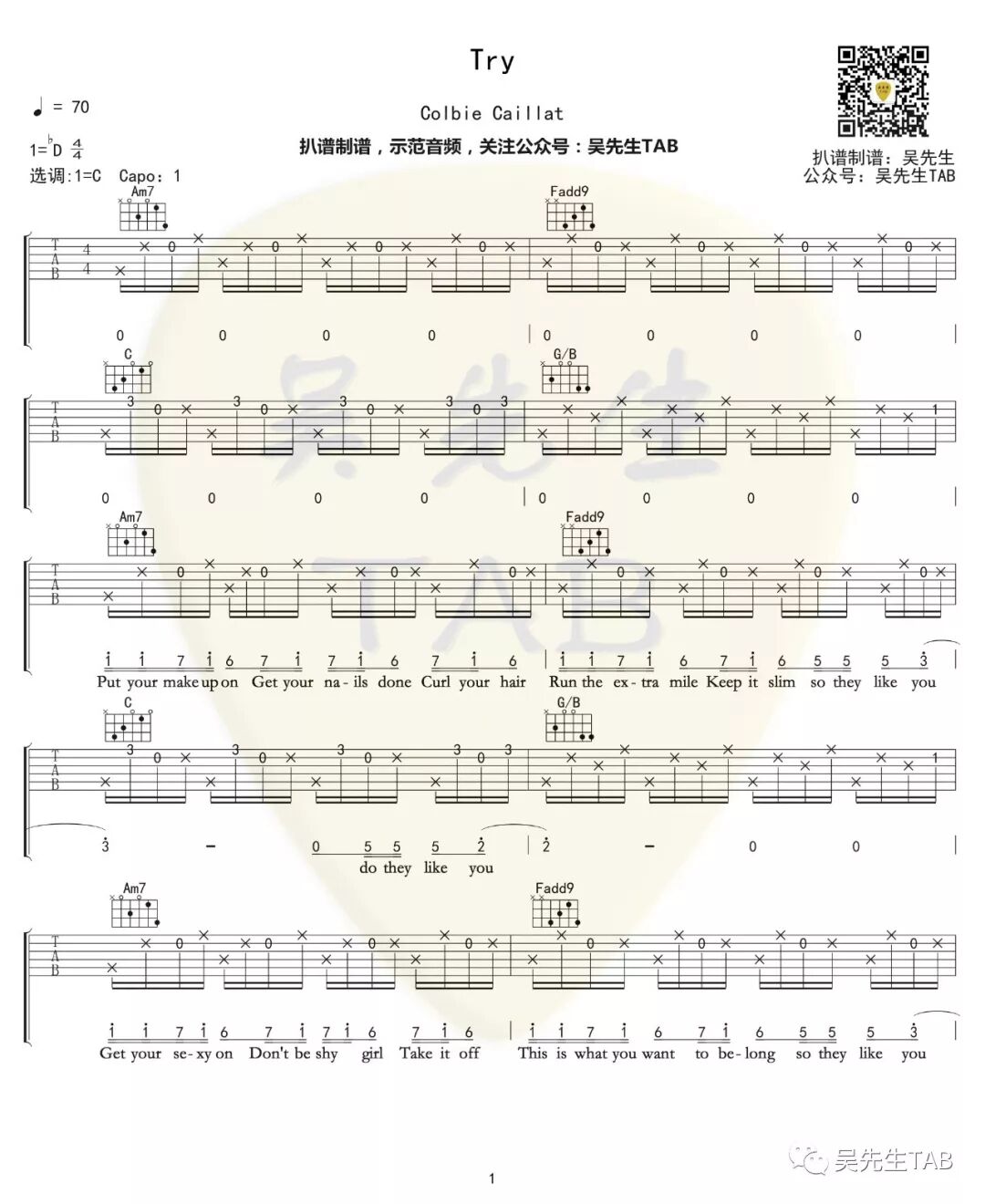 Colbie Caillat《Try》吉他谱【附示范音频】 吴先生TAB 欧美女星 2019-10-25 00:48:15 995 创作不易,用心坚持,欢迎请BaGua喝几杯爱心咖啡!打赏并支持本文 打赏并删除本文 You don't have to try so hard你不必逼自己竭尽全力You don't have to, give it all away你不必逼自己毫无保留You just have to get up, get up, get up, get up你只需要振作起来You don't have to change a single thing你不必逼自己做任何改变《Try》是美国流行女歌手Colbie Caillat演唱的一首歌曲,出自专辑《Gypsy Heart》,于2014年6月9日发行。这是一首特别正能量的歌,MV中参演的女孩在镜头前擦拭掉妆容,卸妆后的女孩面对镜头也露出发自内心的笑容,试着去爱毫无修饰的自己。现如今社会上有那么一些人,太过于在乎别人的想法看法,内心极度敏感,完全活在别人的眼里。别人喜欢什么样,就努力变成什么样,却逐渐忘了自己原本是什么样的人。而这首歌却告诉你:你不必逼自己做任何改变;你不必逼自己毫无保留;你不必逼自己竭尽全力;你不必试着去努力尝试,你只需要振作起来。你不需要在乎别人怎么想你,做自己就好。 创作不易,用心坚持,欢迎请BaGua喝几杯爱心咖啡!打赏并支持本文 打赏并删除本文 感谢您的支持鼓励,我会继续努力的!文章地址:用户邮箱:打赏金额:USDT 请输入数字点击”去打赏“,即可进行打赏支持本文章哦 Colbie Caillat About the Author 吴先生TAB 功能介绍:不定期更新自己扒的谱子。 Related Posts 温岚《夏天的风》吉他谱 2020-04-14 18:56:02 Colbie Caillat《Try》吉他谱【附示范音频】 2019-10-25 00:48:15 发表评论