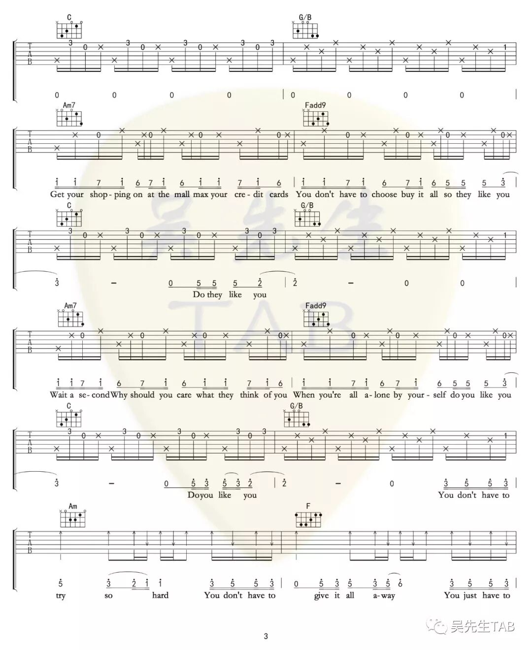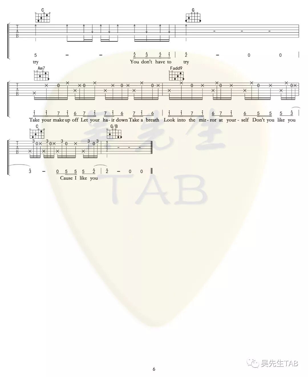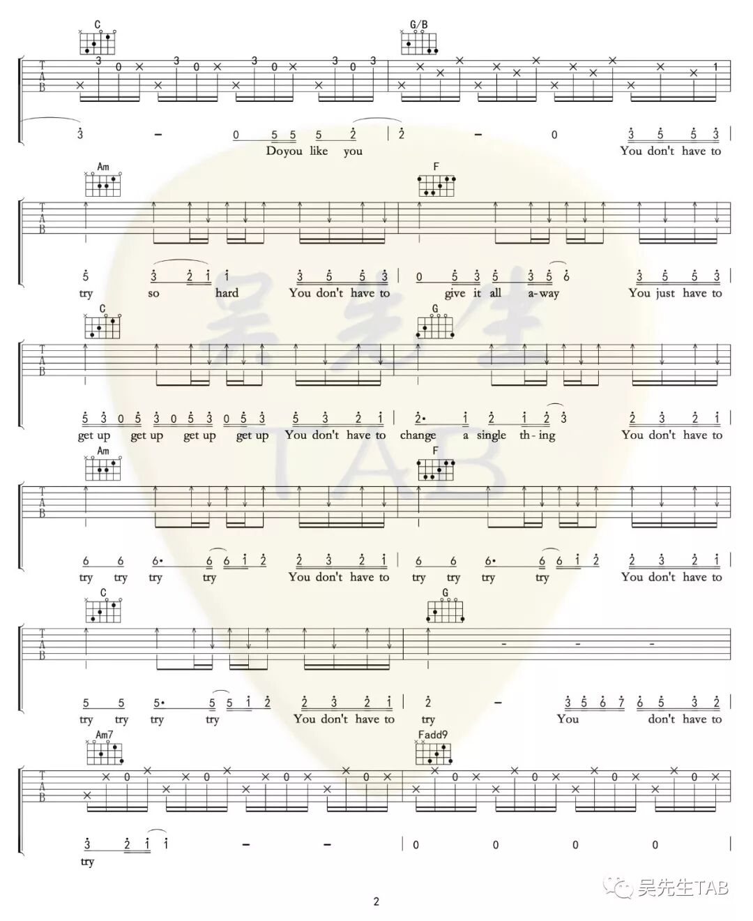 Colbie Caillat《Try》吉他谱【附示范音频】 吴先生TAB 欧美女星 2019-10-25 00:48:15 995 创作不易,用心坚持,欢迎请BaGua喝几杯爱心咖啡!打赏并支持本文 打赏并删除本文 You don't have to try so hard你不必逼自己竭尽全力You don't have to, give it all away你不必逼自己毫无保留You just have to get up, get up, get up, get up你只需要振作起来You don't have to change a single thing你不必逼自己做任何改变《Try》是美国流行女歌手Colbie Caillat演唱的一首歌曲,出自专辑《Gypsy Heart》,于2014年6月9日发行。这是一首特别正能量的歌,MV中参演的女孩在镜头前擦拭掉妆容,卸妆后的女孩面对镜头也露出发自内心的笑容,试着去爱毫无修饰的自己。现如今社会上有那么一些人,太过于在乎别人的想法看法,内心极度敏感,完全活在别人的眼里。别人喜欢什么样,就努力变成什么样,却逐渐忘了自己原本是什么样的人。而这首歌却告诉你:你不必逼自己做任何改变;你不必逼自己毫无保留;你不必逼自己竭尽全力;你不必试着去努力尝试,你只需要振作起来。你不需要在乎别人怎么想你,做自己就好。 创作不易,用心坚持,欢迎请BaGua喝几杯爱心咖啡!打赏并支持本文 打赏并删除本文 感谢您的支持鼓励,我会继续努力的!文章地址:用户邮箱:打赏金额:USDT 请输入数字点击”去打赏“,即可进行打赏支持本文章哦 Colbie Caillat About the Author 吴先生TAB 功能介绍:不定期更新自己扒的谱子。 Related Posts 温岚《夏天的风》吉他谱 2020-04-14 18:56:02 Colbie Caillat《Try》吉他谱【附示范音频】 2019-10-25 00:48:15 发表评论