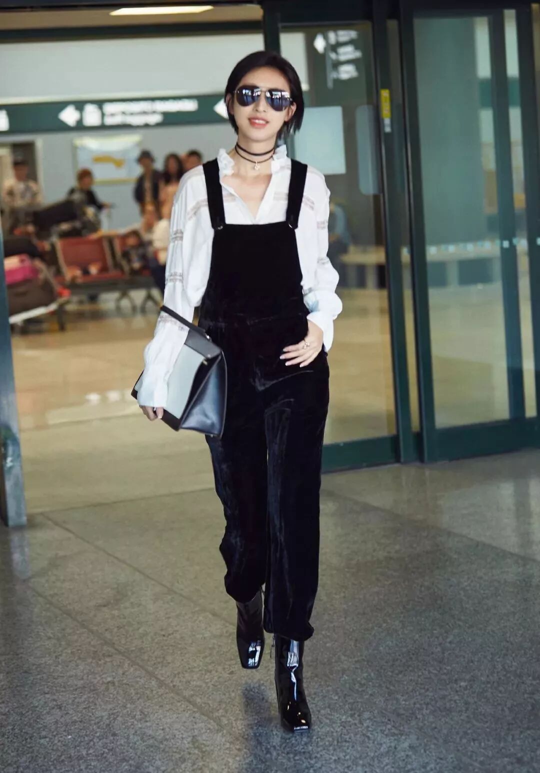 雪纺衬衫搭配黑色背带裤的穿法,十分经典和率性,戴上飞行员墨镜的张俪简直酷到没朋友!