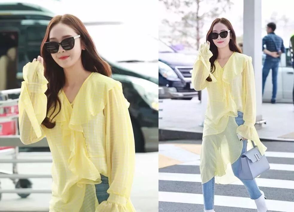 郑秀妍小姐姐也超喜欢飘逸的雪纺衬衫呢!非常衬春天的嫩黄色加上微微一点复古设计的款式,少女俏皮感十足。