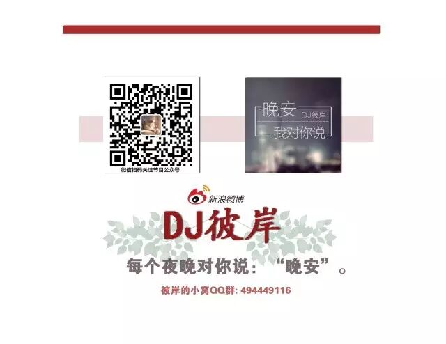 电台DJ、半吊子摄影师、公益志愿者。 只想,用我的声音,温暖你。 ☆ 喜马拉雅“DJ彼岸” ☆ 微博“DJ彼岸” ☆ 听友QQ群494449116 ☆ 投稿邮箱:[email protected]
