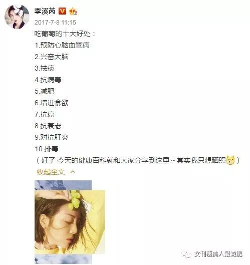 她还要粉丝们多吃葡萄能瘦腿,李溪芮的好身材未必全是吃葡萄吃出来的,但葡萄确实有减肥的功效。
