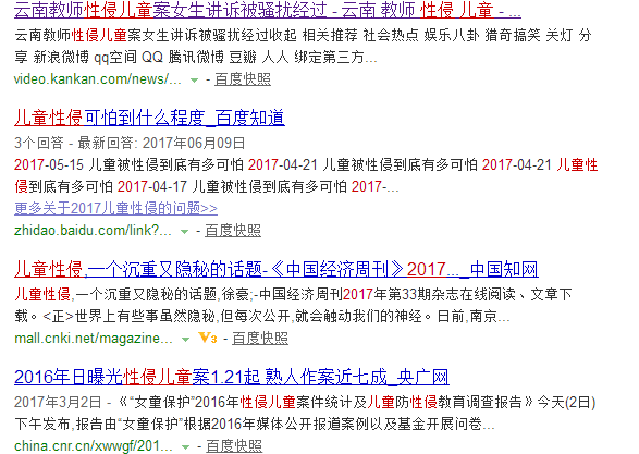 去搜索引擎搜索 #2017儿童性侵#,可以找到 56 万条目。