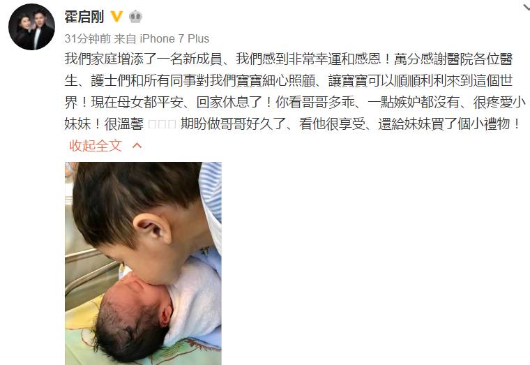 今日(4月24日)午间,霍启刚在微博宣布郭晶晶二胎生下一女,还晒出儿子亲吻小女儿的照片,画面超级有爱↓