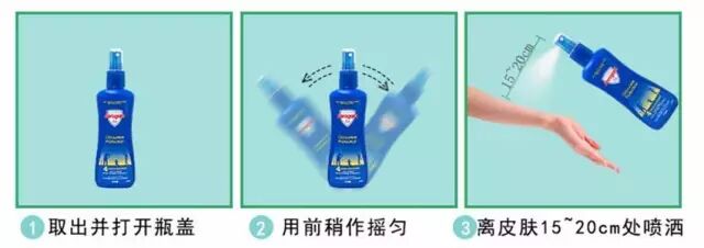 使用前摇匀,在离开暴露的皮肤15-20cm处,正面的喷洒,也可以使用在脸部和手上,但是注意避开眼睛和嘴巴。