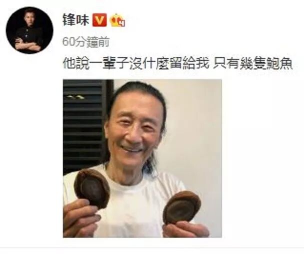 谢贤激罕唔戴黑超,送呢样嘢“回赠”霆锋 娱闻乐 港台男星 2018-09-08 23:01:09 876 创作不易,用心坚持,欢迎请BaGua喝几杯爱心咖啡!打赏并支持本文 打赏并删除本文 艺人谢霆锋同爸爸谢贤(四哥)关系一直都好好,霆锋仲做孝顺仔送楼畀老窦,咁四哥又送啲咩「回赠」个仔呢?呢日霆锋喺社交网上载一张老窦嘅相,见到四哥激罕冇戴黑超,左右手各拎住一只大鲍鱼,笑得相当开怀瞇晒眼,霆锋留言话:「他说一辈子没什(甚)么留给我 只有几只鲍鱼」网民都笑言最后又系霆锋煮好只鲍鱼,畀老窦食番!如何快速收到“娱闻乐”最新动态?- END -本期特惠精选 创作不易,用心坚持,欢迎请BaGua喝几杯爱心咖啡!打赏并支持本文 打赏并删除本文 感谢您的支持鼓励,我会继续努力的!文章地址:用户邮箱:打赏金额:USDT 请输入数字点击”去打赏“,即可进行打赏支持本文章哦 谢贤 About the Author 娱闻乐 功能介绍:每日更新港澳台日韩最新娱乐八卦资讯! 官方认证:广州益街坊广告有限公司 Related Posts 王祖蓝宣布爱女中文名!遗传阿妈基因,百日宴冧爆李亚男 2019-03-18 21:42:07 十指紧扣烟韧买餸,Sammi驯服51岁许志安,戒烟戒蒲狂练副偈! 2019-03-17 21:53:29 张卫健爆临破产边缘,穷到冇钱食饭餐餐赊数度日!好彩遇到佢哋... 2019-03-16 21:43:13 娱快讯 | GEM演唱会延迟两粒钟粉丝嬲爆叫回水,陈法拉搭飞机被嘲似酒店执房员 2019-03-10 22:52:07 娱快讯 | 徐子珊忙写硕士论文紧张到瘦,陈妍希被嘲似“紫薯包”高EQ回应 2019-01-28 21:48:40 发表评论