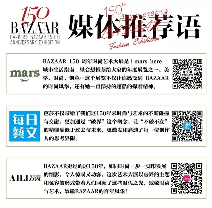 《mars here城市生活指南》将其作为推荐给读者的年度展览之一;《每日艺文》盛赞芭莎“让‘不破不立’的精髓灌溉于过去与未来,更激发和启迪了每一位创作人的思考界限。”;AILI.com表示这次艺术大展以破界的主题和包容的形式带着人们回归了150年的时代之光,令人惊叹又动容拥抱破界,感受新生力,领略时尚150年的动人魅力在此为你臻呈。