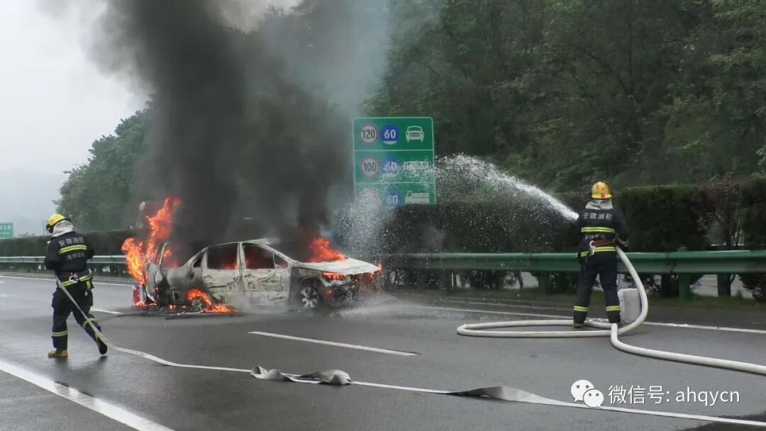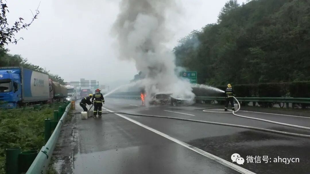 9月20日上午7时许,沪渝高速公路铜陵往安庆方向池州九华山风景区出口处,两辆轿车发生事故,后车追尾致车辆起火,消防部门迅速赶赴现场处置。