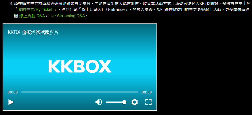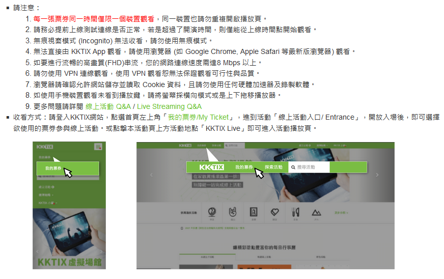 请在购买票券前请务必确保能够观赏此影片,才能在演出当天观赏无虞。收看本活动方式:消费者须登入KKTIX网站,点选首页左上角