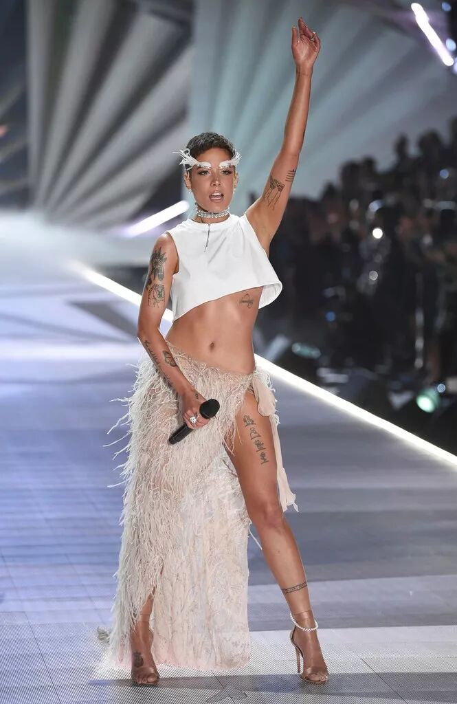 猴西Halsey身着高开衩羽毛礼服演唱《Without me》!造型非常有个性,不仅身穿羽毛开衩半裙,连妆容都有羽毛的参与,身材也是很好。