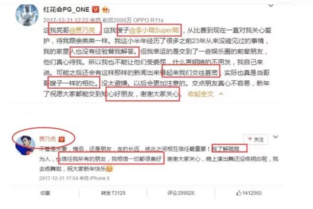 这件事一时间在网上也是闹得沸沸扬扬的,当事人都出来做出了回应,最先做出回应的就是PG one,在网上表示自己把贾乃亮李小璐当作自己的哥哥嫂嫂,但没想到会发生这样的事情,就连贾乃亮也在网上声明自己相信李小璐。