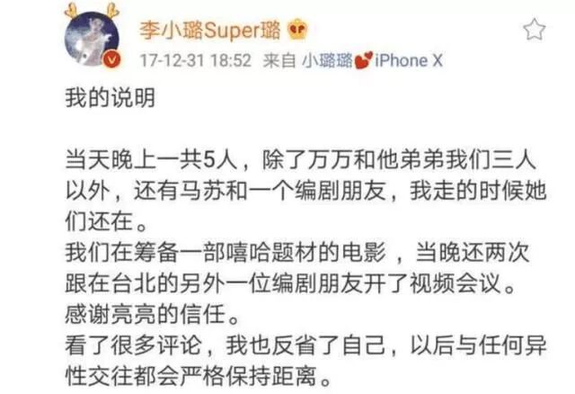 李小璐也在网上声明自己把PG one当作自己的弟弟,当时在场的人不止他们两个没就连马苏也在,随后就是马苏的发文。