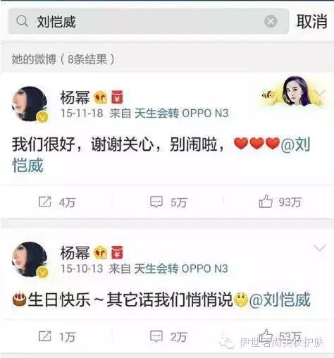 而两人的互动更是少得可怜,15年,也就是两人新婚不久,应该还是如胶似漆的时候。在杨幂的主页上搜索刘恺威,相关的微博,主要就是生日祝福,帮老公刘恺威和闺蜜唐嫣宣传新戏……