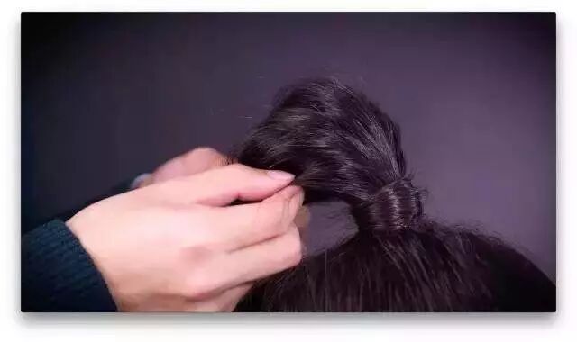 步骤3、将剩下的马尾绕着橡皮筋旋转,缠绕到马尾根部;