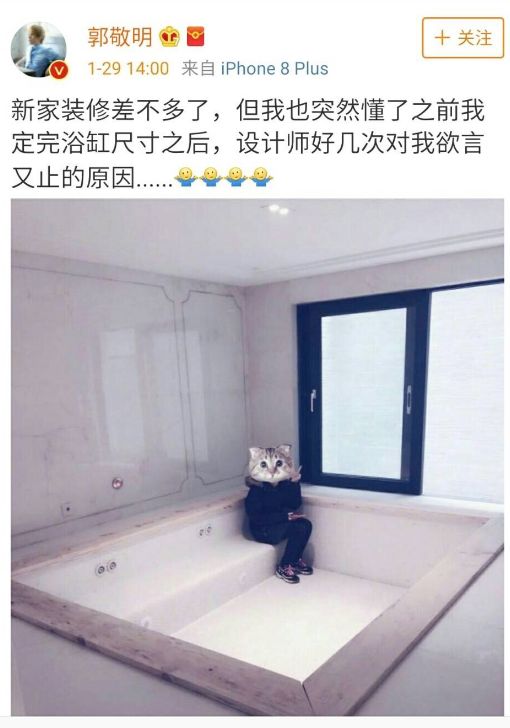 郭敬明秒删了一条微博,晒的是他的新家和他新家的超大浴缸。