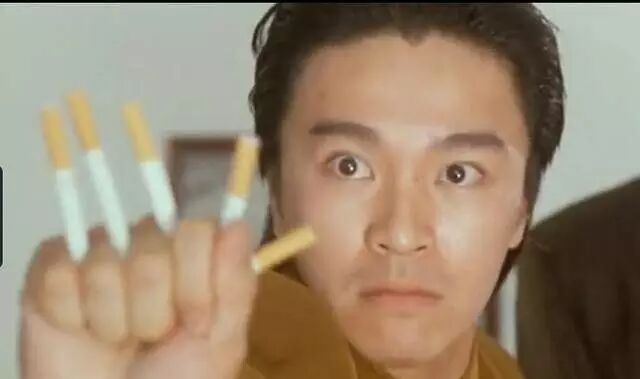 周星驰第一次见到刘德华的时候,刘德华用巧克力切出四个A,然后星爷直接从达叔口袋中掏出五支烟。国语中直接翻译为“各位观众,五支烟”,而粤语版则是“各位观众,五条烟”,区别在哪里呢?这个梗就在于粤语地区一般把黑桃A称为“烟屎”,简称“烟”。所以懂粤语的观众,会以为星爷要变出五张黑桃A,结果变出来五跟烟。这就是笑点所在。