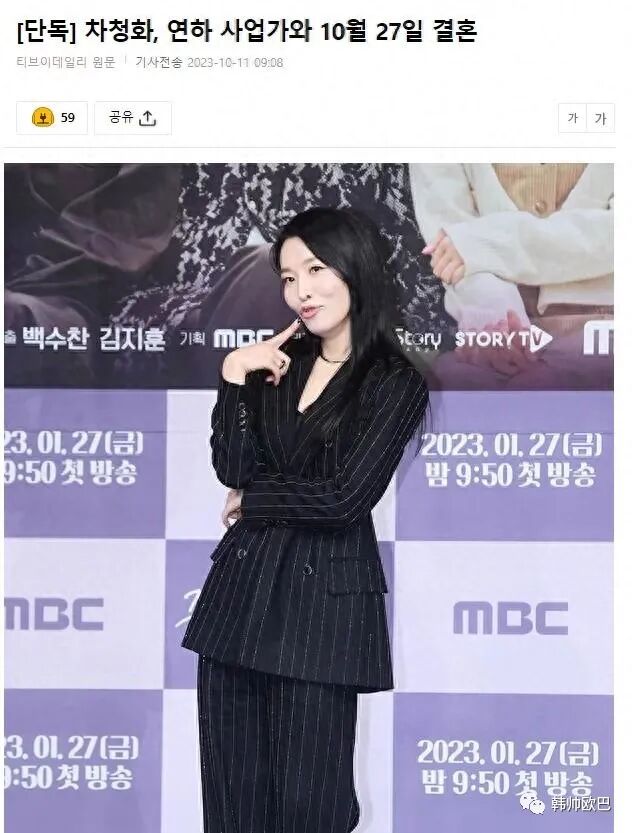 11日,有韩国媒体报道,43岁的女演员车清华成为“十月新娘”。据悉,车清华将于27日在首尔某地与年轻商人结婚。