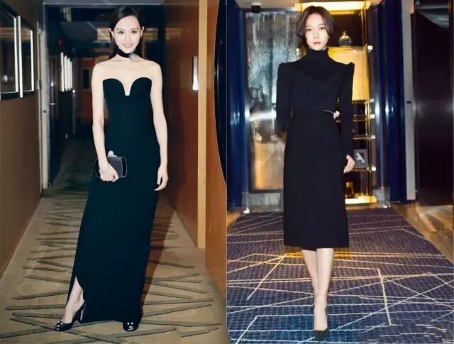 同样的黑色礼服,相比唐嫣肤色较黑的王珞丹穿出来成熟稳重的感觉。
