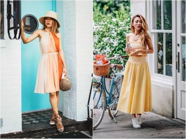 柠檬黄和渐变橙色的裙装,这样的画风,夏天这样穿最合适。