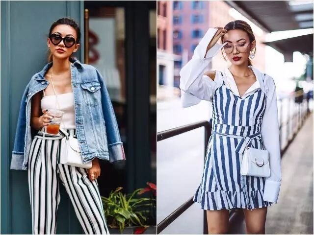 蓝色条纹裤子和连衣裙,配白色的上衣,这种层次的搭配,不会太单调。