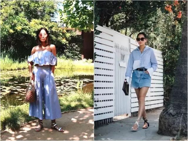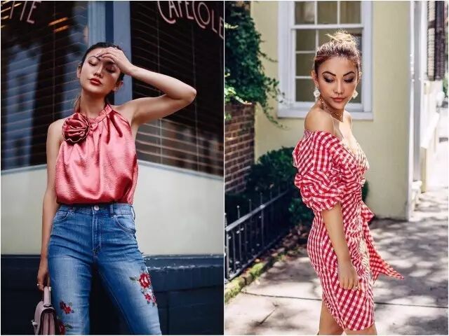 枚红色的真丝上衣和绣花牛仔单品,露肩红白相间连衣裙,是夏天的必备单品,这样相互呼应的配色,怎么会因为皮肤黑而不时髦呢。
