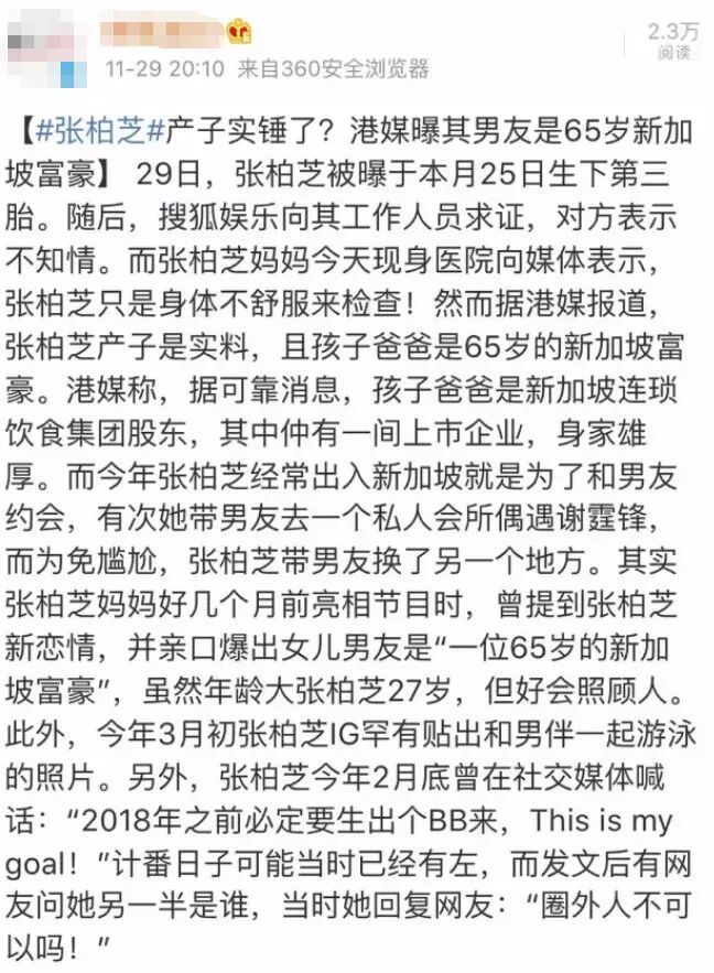 有媒体爆料说孩子父亲是一位65岁的新加坡富豪。今年张柏芝频繁前往新加坡,就是为了去约会。