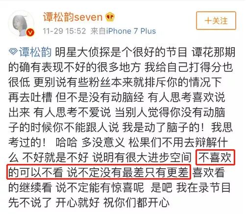 11月29日,谭松韵在个人社交账号发文,回应被网友批评其在某档综艺节目中“没梗”、“没存在感”一事。