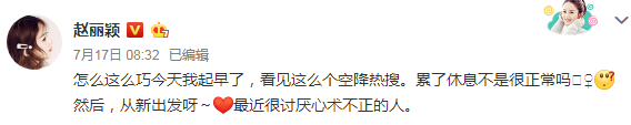 怎么这么巧今天我起早了,看见“赵丽颖停工原因”空降了热搜。累了休息不是很正常吗?然后,重新出发呀!最近很讨厌心术不正的人。