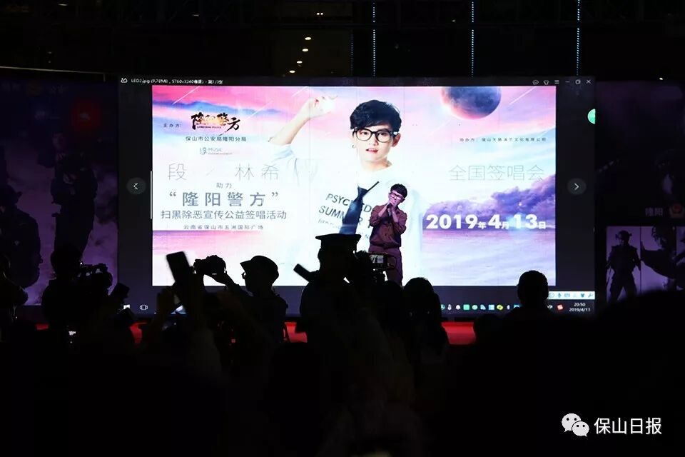 4月13日晚,五洲国际广场人头攒动,歌声飘扬——段林希助力“隆阳警方”扫黑除恶宣传公益签唱活动在这里火热举行。段林希用优美的歌声向市民传递了向好向善向上的正能量。