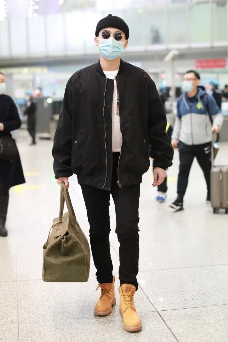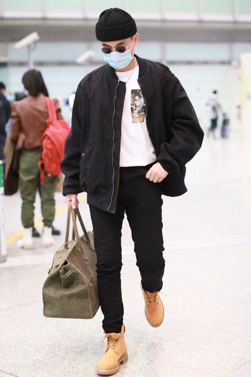 不过欧豪机场的这身大黄靴搭配效果还是不错的了,首先是颜色够协调,上身为黑色夹克与印花白色T的搭配,加上塞衣角提高腰线搭配,呈现出简洁利落的层次效果,黑白配经典协调又不显花哨,同时又能作为调和色来搭配,所以用以配合大黄靴搭配再适合不过;