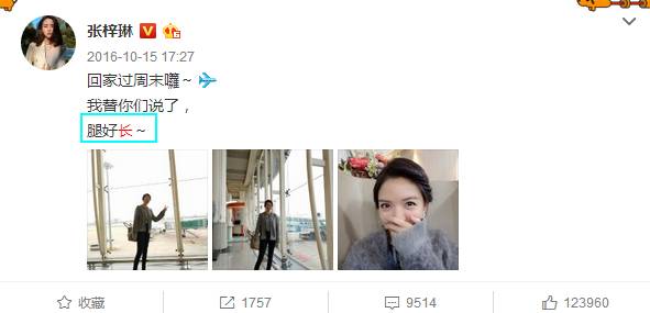 先看看所长最近可喜欢的小姐姐张梓琳,别看她微博评论里只要晒照片就满屏的夸腿长,她自己有时候还会调侃自己腿长