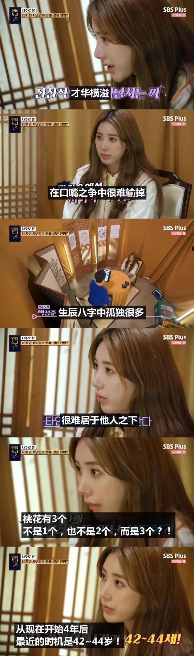 对于徐仁英的结婚运势,命理道士解读说:“在你的生辰八字中基本上看不见男人。从趋势上来看,不管怎么寻找都是很难的。你接受不了结婚生子、照顾丈夫的生活方式。你的工作气息很强,结婚运势最好的时机是42~44岁”。而徐仁英回答说目前还不想结婚时,命理道士再次表示“如果错过了那个时机,就会变成54~55岁才能结婚”。