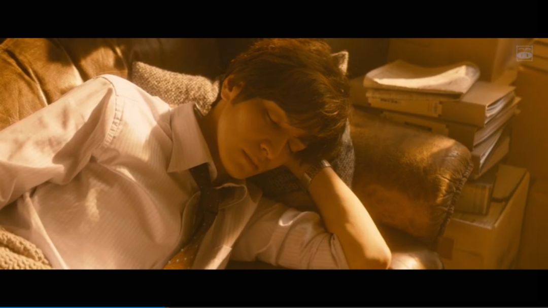 告白这一幕当然要拍出美感~~夕阳洒进微风吹过的房间,男主正在沙发上睡觉(不要纠结为什么在办公室睡觉以及为什么睡觉不关门的问题),摆了个美美哒睡美男POSE。