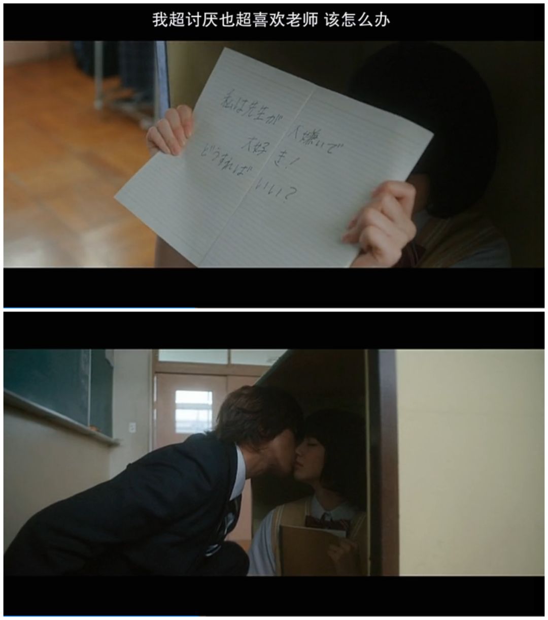 女主躲在讲台下向男主告白,情难自禁的男主假装捡笔,蹲下来吻她(这个也太……下面坐着一屋子学生呢)。