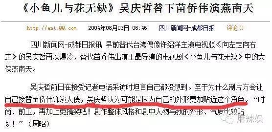《小鱼儿与花无缺》,当年燕南天这个角色原定是由苗侨伟出演,然而制片方却让吴卓翰接替苗侨伟出演。