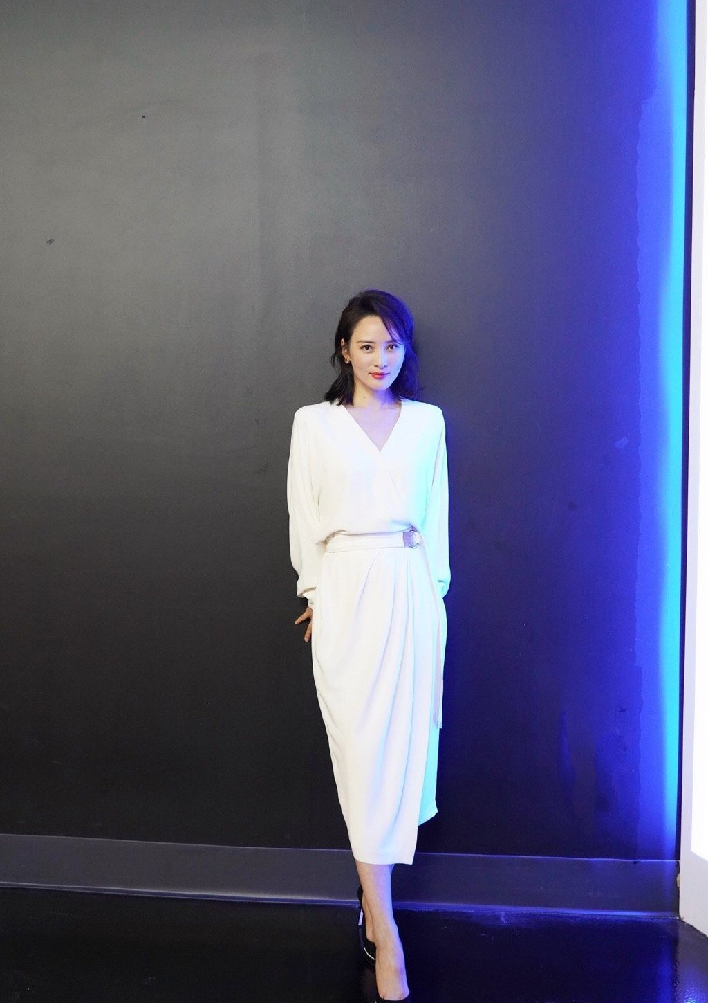 其实可以发现她个人还是比较喜欢穿白色的裙子,这个时候也是穿了一条白色的裙子,不过腰间有一条腰带,这样的话就以那种提拉的效果显得整个人下面的这一双腿看起来都会更长一些