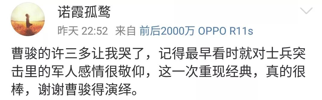 最后“送史今班长”的那一声嘶喊更是直戳观众的心口,让人泪目。这个声泪俱下的热血男儿完全走进了“许三多”这个角色中。