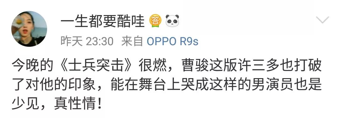 但终于清醒地知道班长是真的留不住之时,情绪战胜理智占据了制高点,这时眼泪便挣脱了束缚,倏地落了下来。“一秒落泪”让人动容,也充分体现出了曹骏在线的演技。