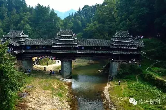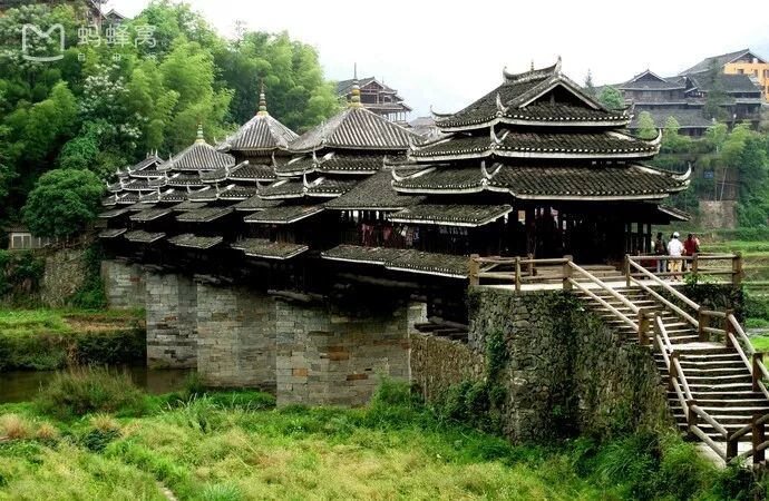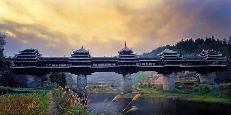 又叫泳济桥、盘龙桥,是典型的侗族建筑,横跨三江林溪河,木石结构,建于1912年,河中有五个石砌大墩,桥面架杉木,铺木板。桥上有栏杆和屋顶,还有5个多角亭,具有独特的侗族韵味。桥长64.4米,宽3.4米,高10.6米。更让我们为之惊叹的是,整座桥梁不用一钉一卯,大小条木,凿木相吻,以榫衔接,巧夺天工!