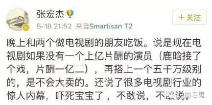 央视批演员天价片酬,其实这是一个行业现象,现在进入影视圈的新手和热钱越来越多,特别是一些准备上市的公司,为了拼业绩,动辄投资几个亿拍影视剧,盲目上马请大牌明星,抬高了明星片酬。在他们眼中,名演员可以和投资成功划等号,所以只请明星,不用新人。“大牌愁档期,小牌愁没戏”的现象比比皆是。娱乐圈竞争市场化,明星的待价而沽,更多的是随行就市。说到底,明星片酬的虚高,背后最重要的推手是资本的竞逐,并不应该指向某个演员单独挡枪。