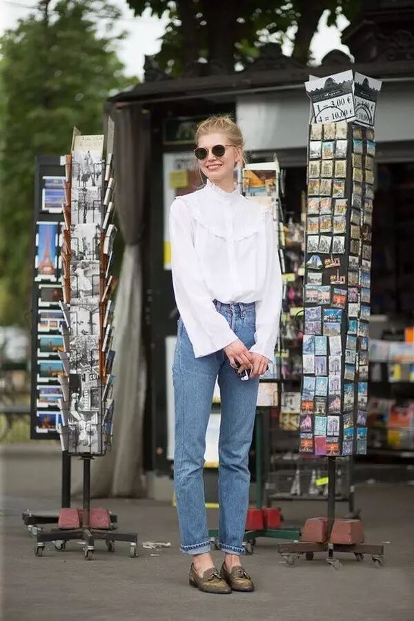 花边立领的复古款白衬衫
