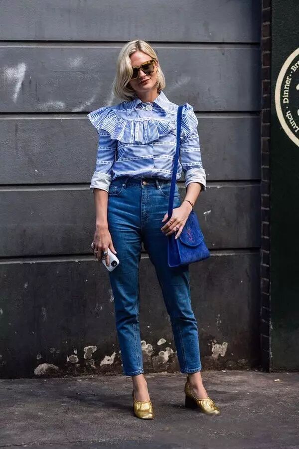 袖子是荷叶边的蓝衬衫