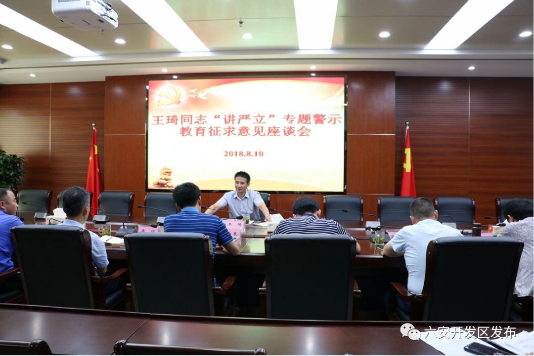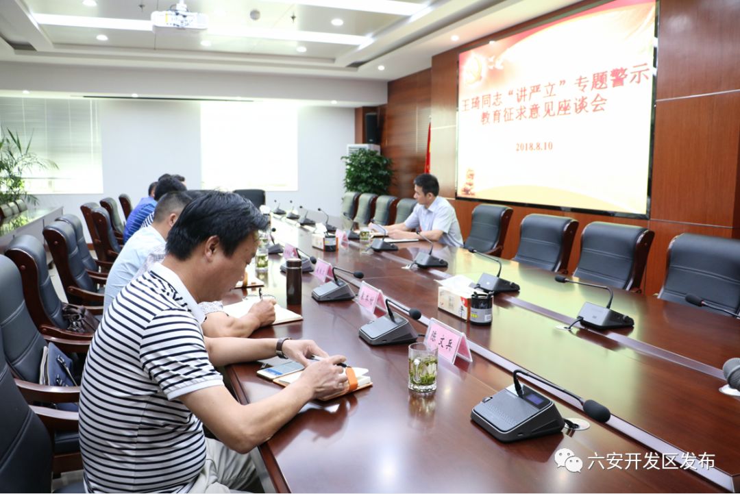 8月10日上午,市委常委、统战部长,开发区工委第一书记、管委主任王琦主持召开六安经济技术开发区“讲忠诚、严纪律、立政德”专题警示教育征求意见座谈会,广泛听取区内直属部门、社区、村和企业代表对开发区工委、管委及其本人在忠诚意识、党的建设、纪律观念、工作作风、干部担当作为等方面的意见建议。组织人社局、财政局、征收安置办、城管综合执法局、重点局、杭淠湾社区、双桥村等单位主要负责人以及九仙尊霍山石斛等企业主要负责人参加座谈会。