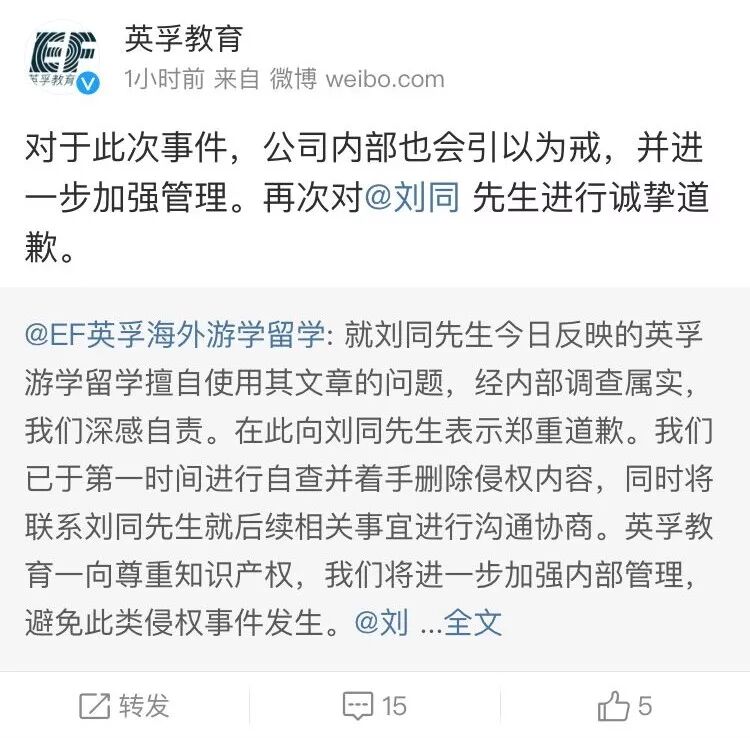 1月24日下午,在刘同发布维权文章几个小时后,英孚教育的官方微博发布了道歉声明称:对于此次事件,公司内部也会引以为戒,并进一步加强管理。再次对@刘同先生进行诚挚道歉。